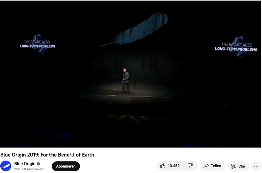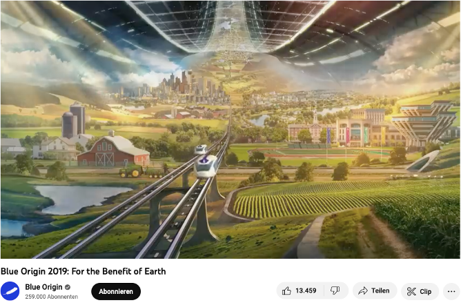 Von Blue Origin ist zumeist dann in den Medien die Rede, wenn wieder einmal Prominente (zuletzt etwa die Sängerin Katy Perry) den zehnminütigen Weltraumflug und die körperliche Schwerelosigkeit nutzen, um die eigenen Erfahrungs- und ‚instagrammable‘ Darstellungsweisen anzureichern, und den Perspektivwechsel (Overview) weniger als einschneidendes, emotionales Erlebnis denn als Effekt fürs Selbstmarketing entdecken. Jenseits dieser kurzlebigen Sensationen hat Bezos mit seinem Unternehmen – wie er in der Keynote „For the Benefit of Earth“ 2019 darlegte – jedoch größere, ernstere Ziele. Er sieht die Menschheit polykrisenbedingt vor einer „very long list of urgent and immediate problems“ stehen, meint damit Armut, Hunger oder den Klimawandel. Diese Probleme versucht er einerseits, mit dem von ihm gegründeten Earth Fund zu lösen – bis 2030 will Bezos hier allein über 10 Mrd. USD für neue Projekte und Technologien bereitstellen, wie. z.B. elektrische Schulbusse oder 0-Emissionen-Transportschiffe. Andererseits will der Amazon-Gründer auch unseren Zeit- und Denkhorizont erweitern: „there are also long-term problems“ – womit er nicht die klimakatastrophischen Notlagen – von Überschwemmungen, Dürren, Bränden oder Gletscherschmelzen – meint, sondern die schwindenden Energieressourcen der Erde. Die Energiegewinnung durch Wind oder Sonne könnten den Bedarf nicht decken, alsbald kämen Öl und Gas an ein Ende, und so sei die Erde zu klein für die Möglichkeiten der Menschen. Wir müssten uns langfristig, gibt Bezos in seiner Keynote zu bedenken, zwischen Stillstand oder Wachstum entscheiden.[6]